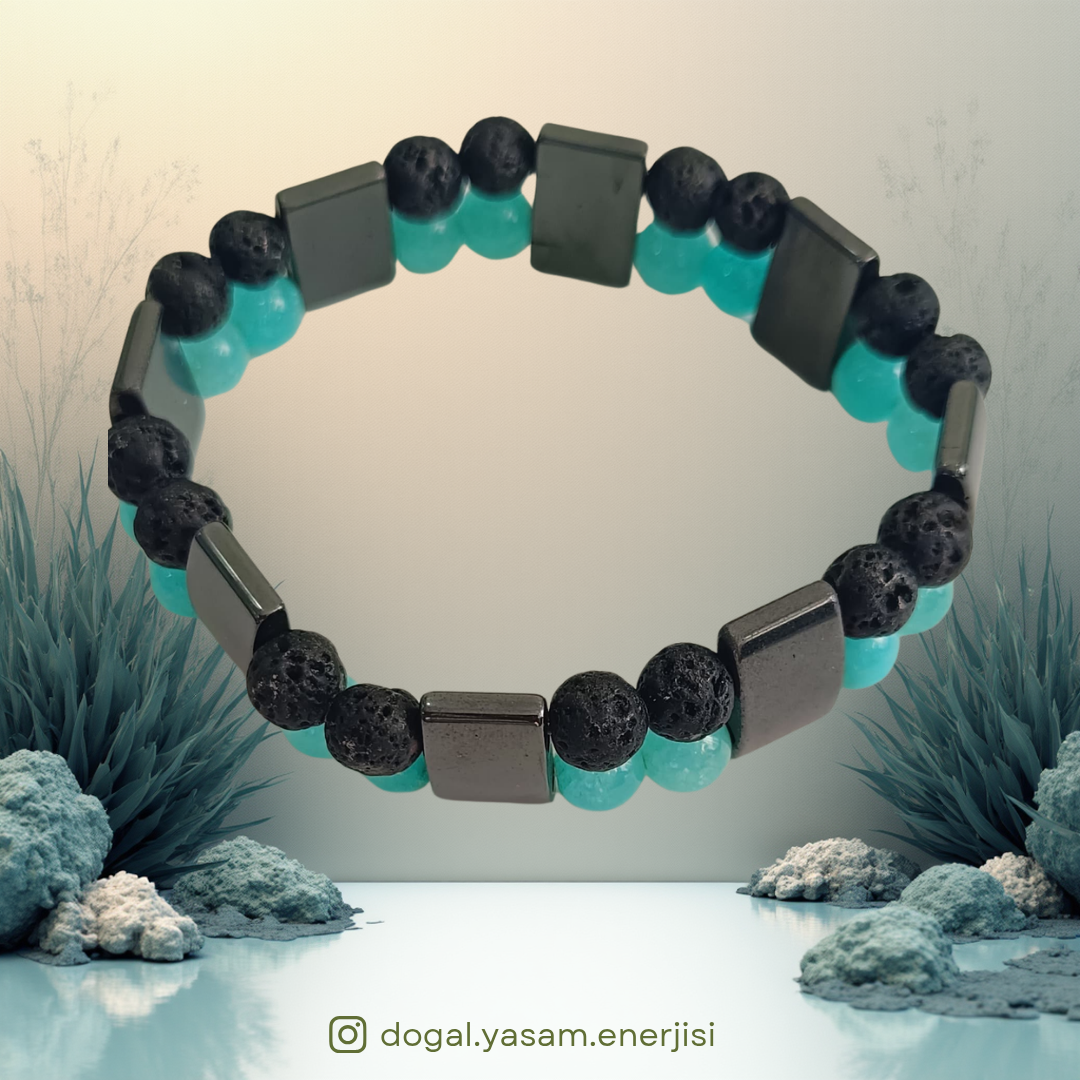 Doğanın zıt kutuplarını bir araya getiren bu çift sıralı özel tasarım bileklik, lav taşının ham dokusu ile mavi kuvarsın dinginliğini modern bir estetikle buluşturuyor. Lav taşının kendine has gözenekli ve karakteristik yapısı tasarıma güçlü bir karakter katarken, mavi kuvarsın huzur veren pastel tonları bu enerjik duruşu asil bir biçimde dengeliyor. Tasarımın omurgasını oluşturan metalik hematit blokları, bilekliğe modern bir kontrast kazandırmanın yanı sıra hem sağlam hem de vakur bir duruş sergilemesini sağlıyor. Çift sıralı yapısıyla bilekte tok ve etkileyici bir görünüm yaratan bu parça, doğal taşların benzersiz dokusu sayesinde her kullanıcıya özel bir deneyim sunuyor. Günlük kombinlerinizde hem doğallığı hem de karizmatik bir şıklığı ön plana çıkarmak isteyenler için hazırlanan bu özel aksesuar, kendiniz için seçkin bir tercih olmasının yanı sıra sevdikleriniz için de anlamlı ve nitelikli bir hediye alternatifidir.