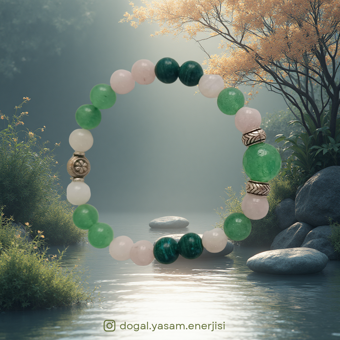 Malahit, pembe kuvars, ay taşı ve aventurin taşlarının zarif birleşimiyle tasarlanan bu özel bileklik, stilinizde baharın taze enerjisini ve renklerin huzur veren uyumunu hissetmeniz için hazırlandı. Tasarımda yer alan malahit taşının derin ve karakteristik yeşil tonları yenilenmeyi ve asil bir duruşu simgelerken, pembe kuvarsın soft dokusu tasarıma şefkatli bir zarafet ve estetik bir derinlik katar. Işıltılı yansımalarıyla dikkat çeken ay taşı, takınıza mistik bir hava ve asil bir parıltı kazandırırken; aventurinin doğal yeşil tonları doğanın ferahlığını stilinizle buluşturur. Her bir taşı özenle seçilen bu tasarım, doğal materyallerin özgün yapısı gereği tamamen size özel bir görünüm vadederek hem günlük kombinlerinize sofistike bir dokunuş sağlar hem de sevdikleriniz için anlamlı ve kalıcı bir hediye seçeneği sunar.